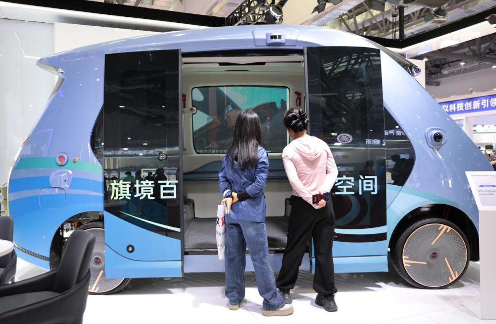 在第63届高等教育博览会会场一汽红旗展区,两位参观者正在参观红旗的新款车辆。