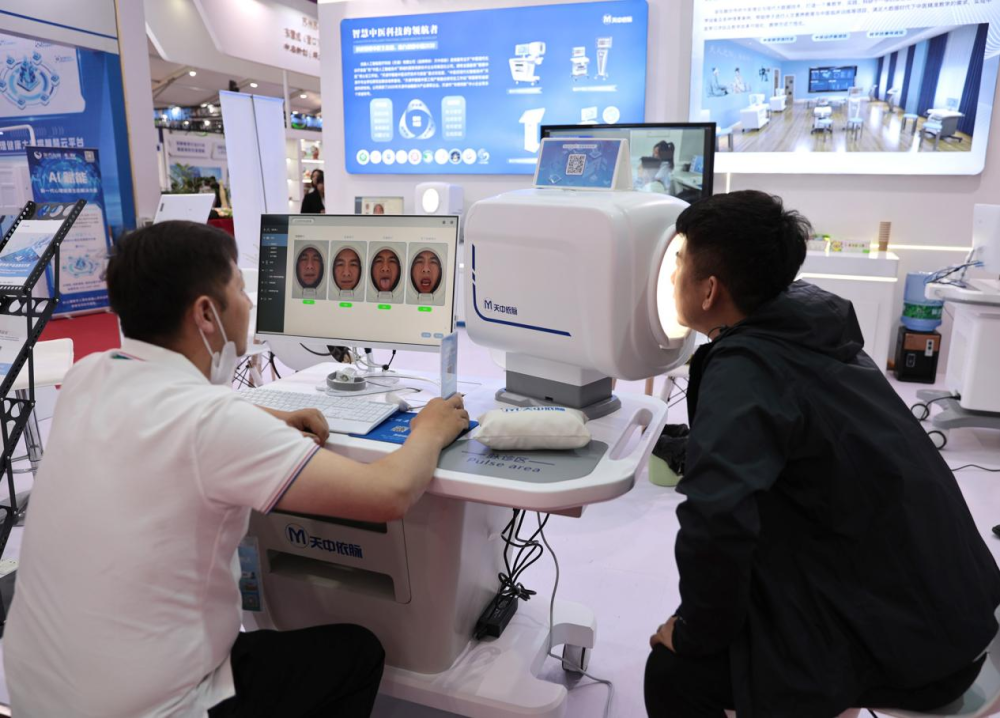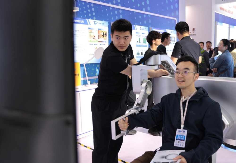 在第63届高等教育博览会会场,一位参观者正在体验参展的医疗设备。