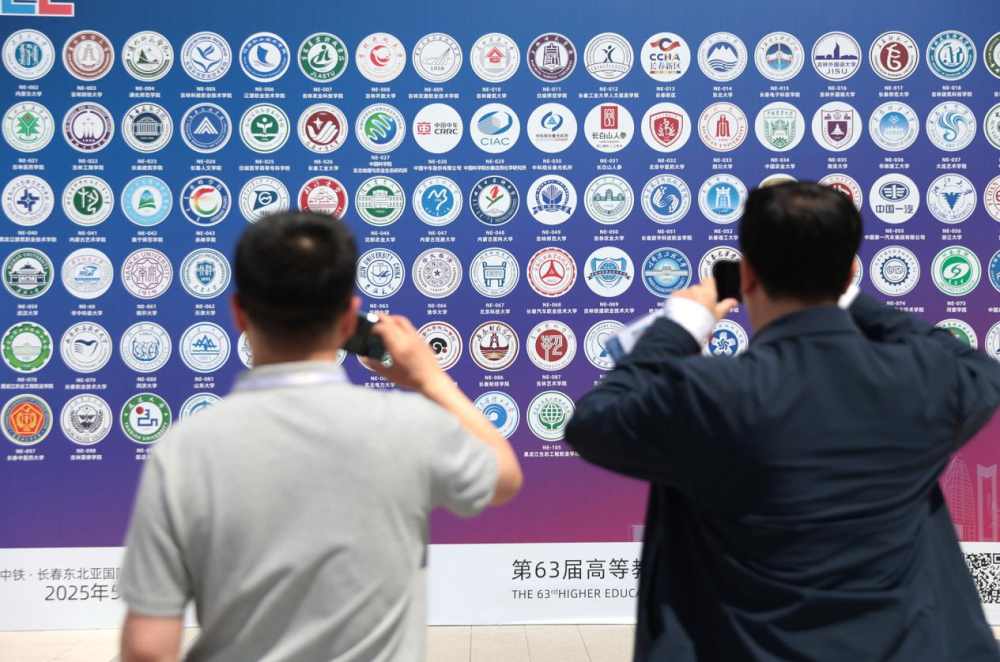 两位参观者正在参展高校校徽墙前拍照。