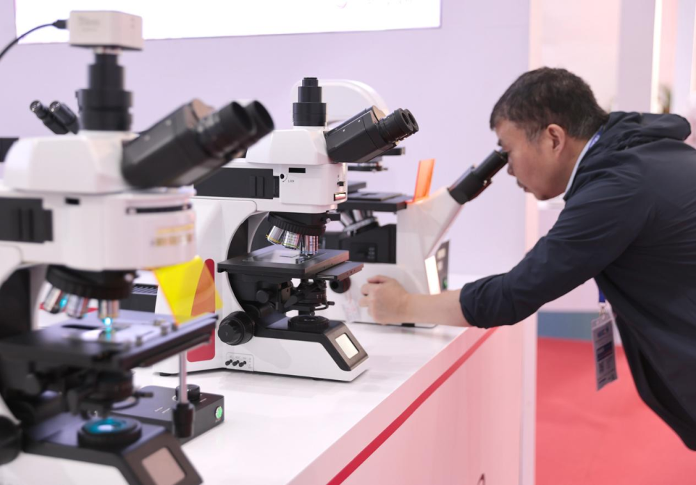 在第63届高等教育博览会会场,一位参观者正在体验显微镜产品。