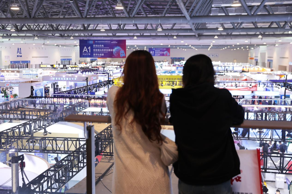 两位参观者正在俯瞰第63届高等教育博览会会场。