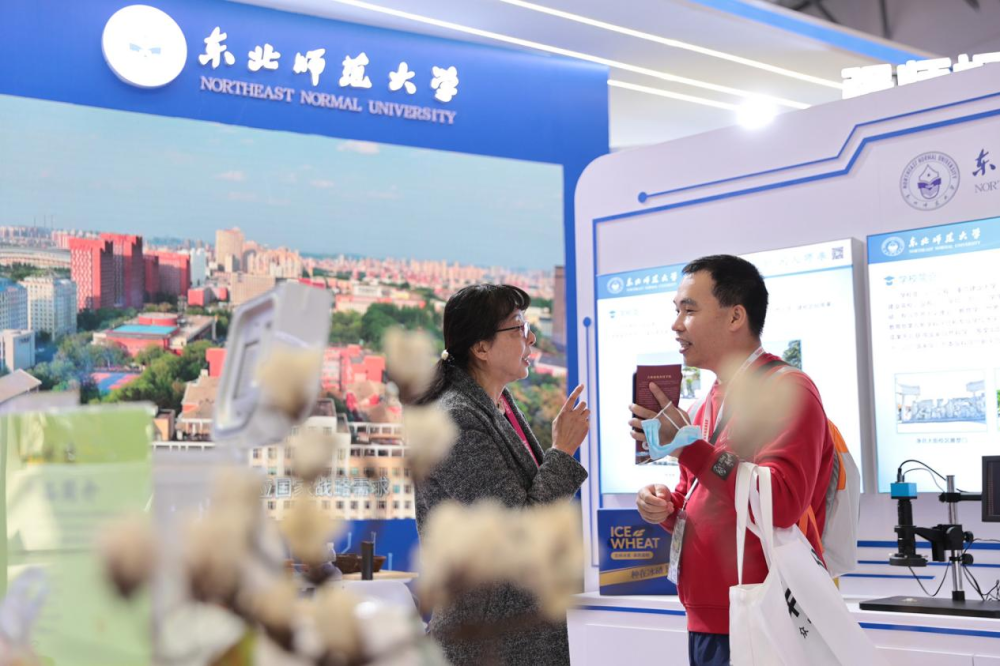 在第63届高等教育博览会会场东北师范大学展区,两位参观者正在交流。
