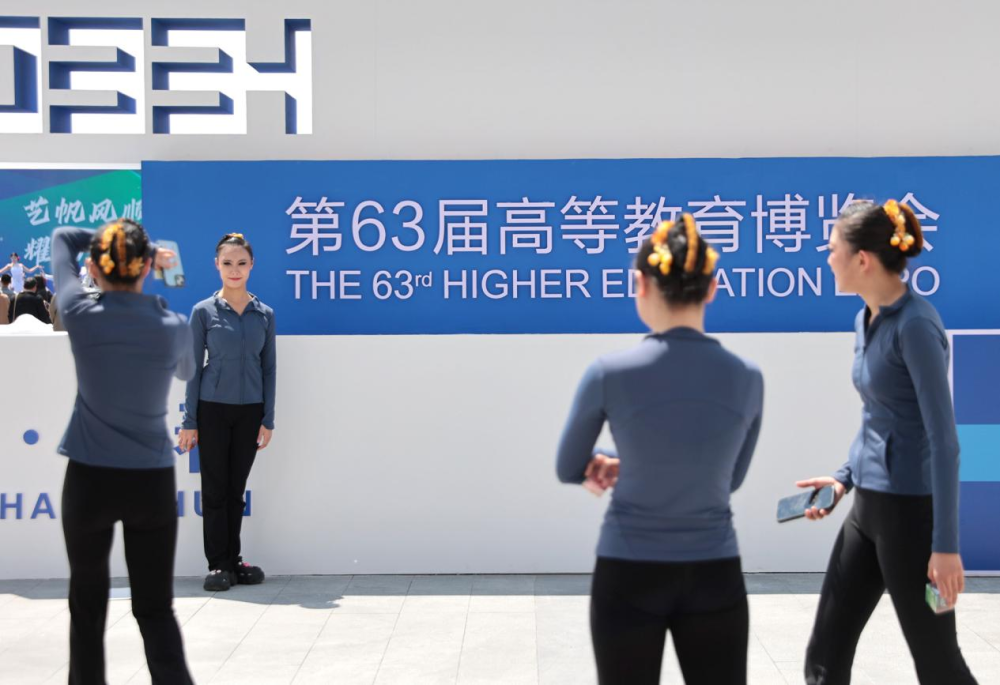 几名参观者正在第63届高等教育博览会会场拍照留念。