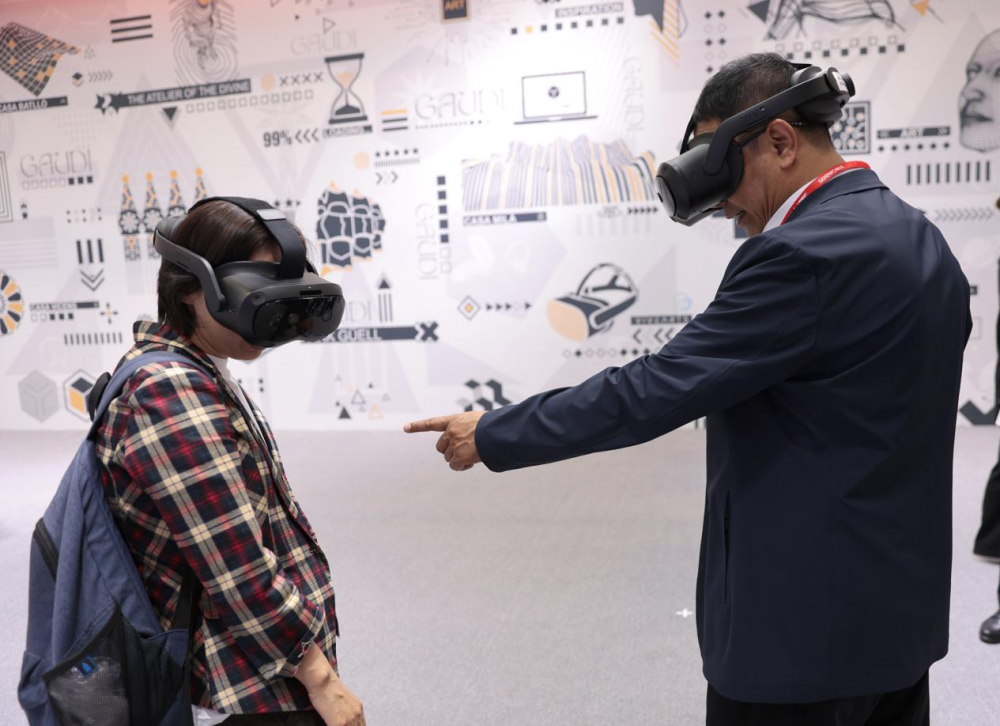 在第63届高等教育博览会会场,两位参观者正在体验VR展区的装备。