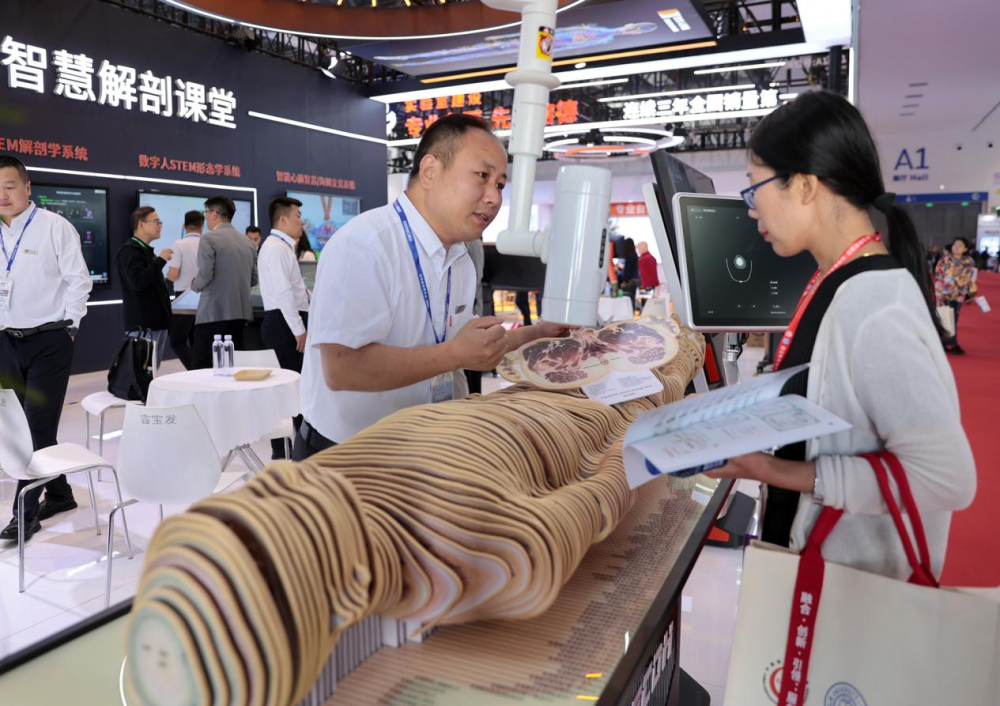 在第63届高等教育博览会上,一位参展商正在介绍人体切片模型。