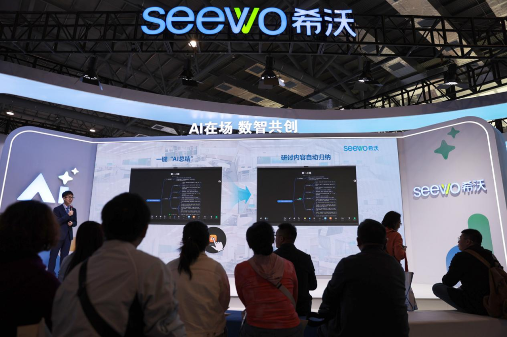 第63届高等教育博览会的一个AI展位前吸引了不少观众参观。