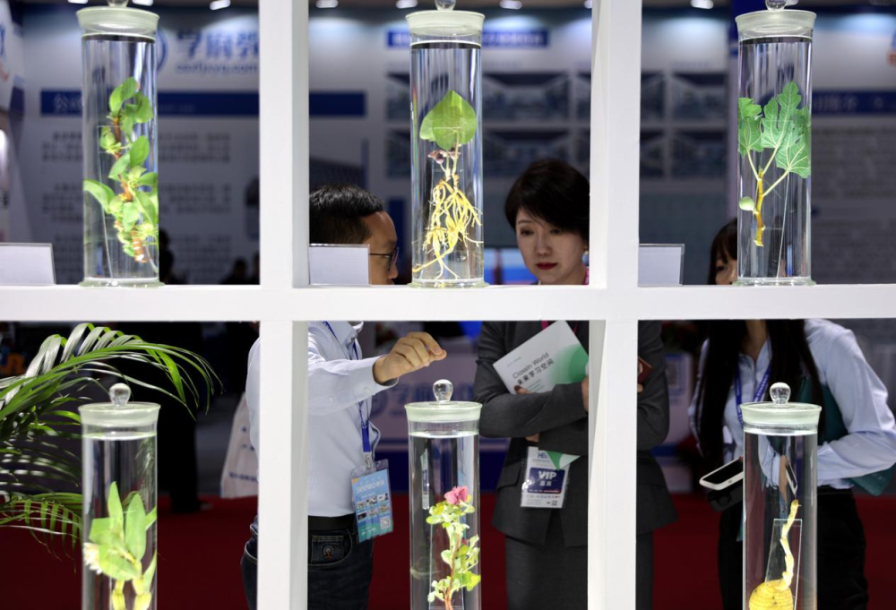 第63届高等教育博览会会场,一位参展商正在向参观者介绍植物标本。