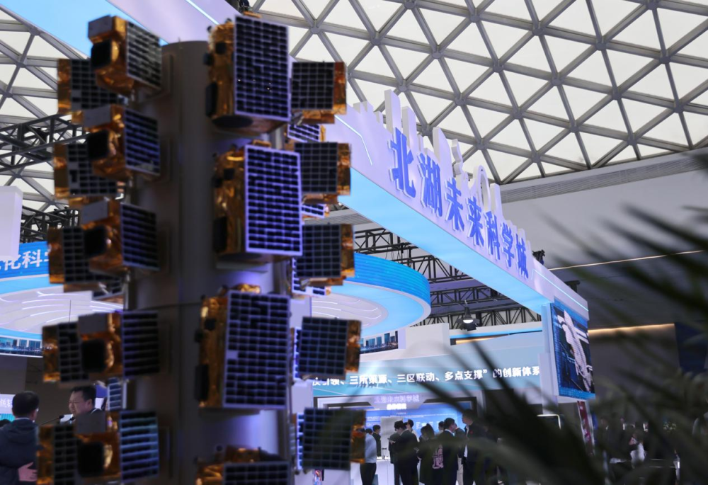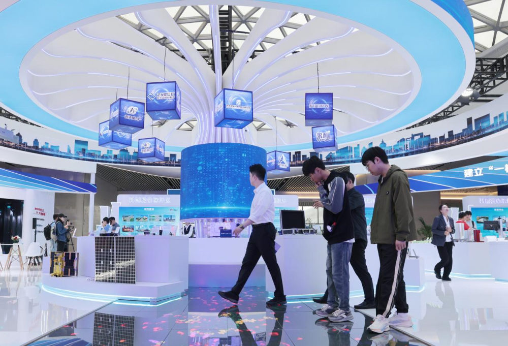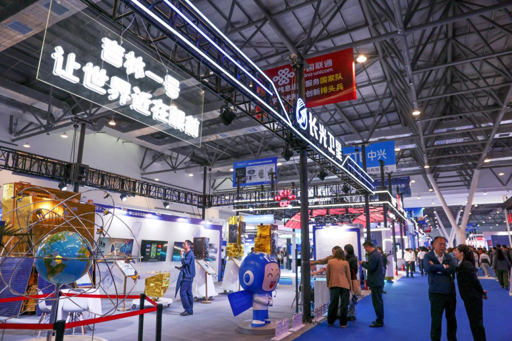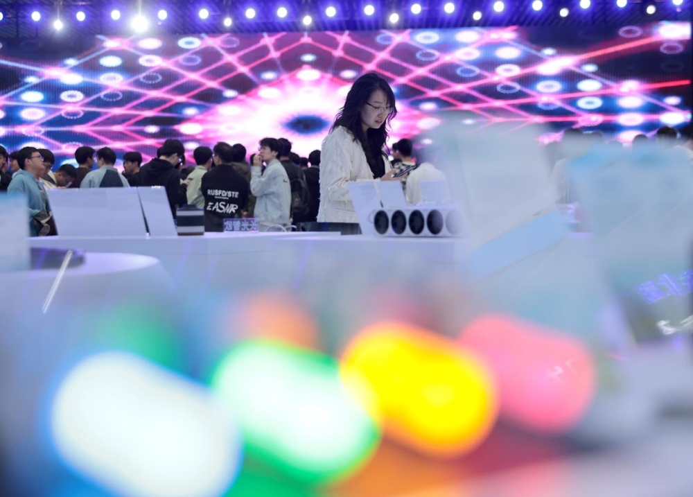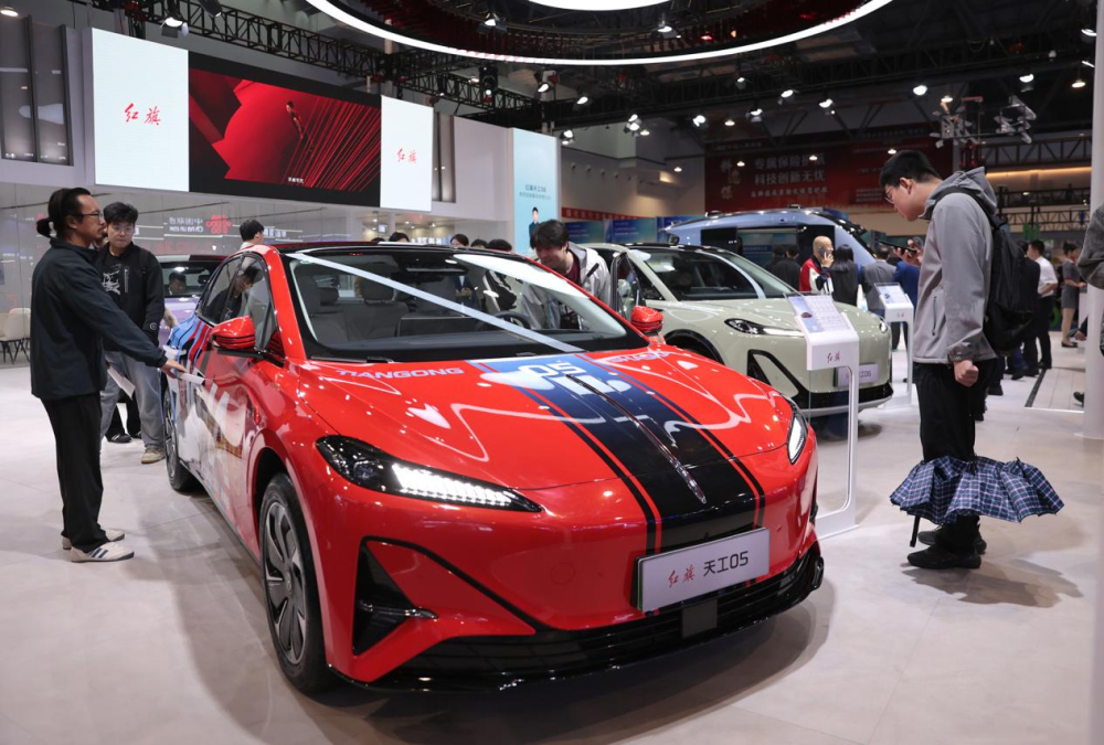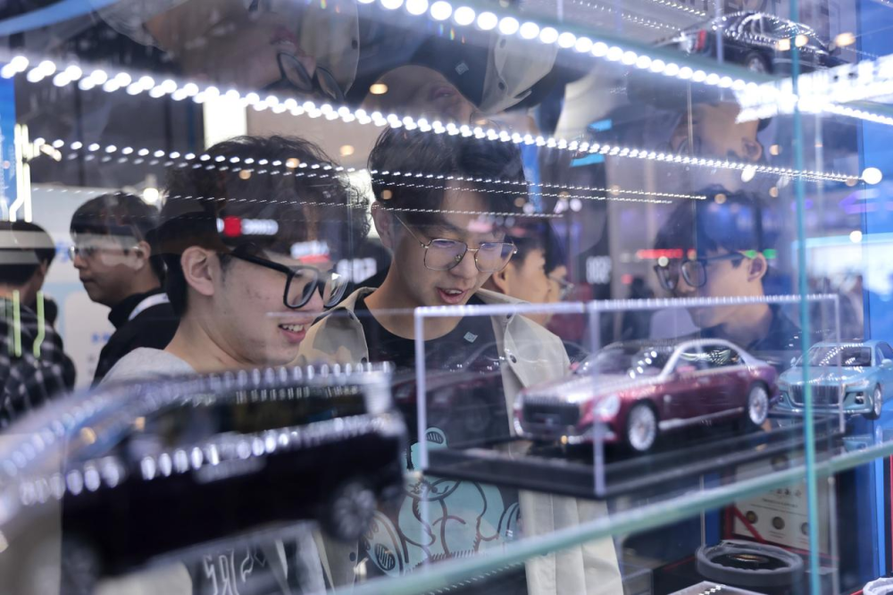 这是两名观众在参观2025长春光博会长春汽开区展区的展品。