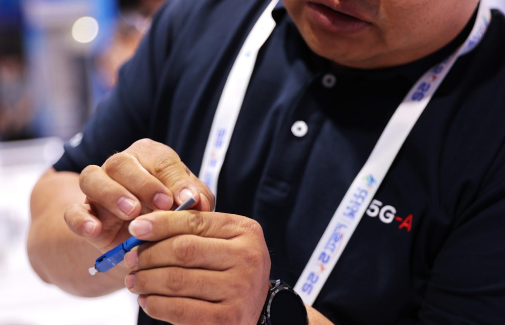在2025长春光博会现场一位工作人员正在讲解光纤设备。