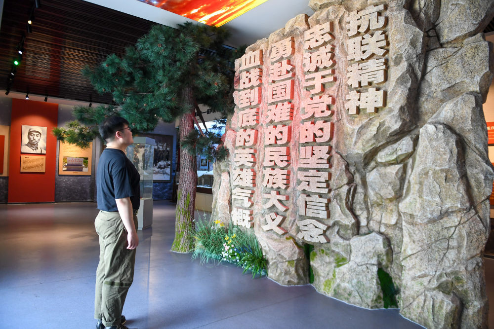 ↑ 8月11日,在磐石市官马新村红色历史陈列馆,马铖明为游客介绍抗联历史。