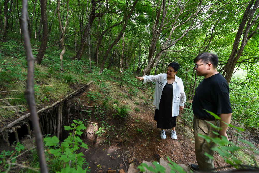 ↑ 8月11日,在位于吉林磐石的红石砬子抗日根据地遗址,磐石市抗日斗争纪念馆馆长李秋虹(左)向马铖明介绍抗联历史。