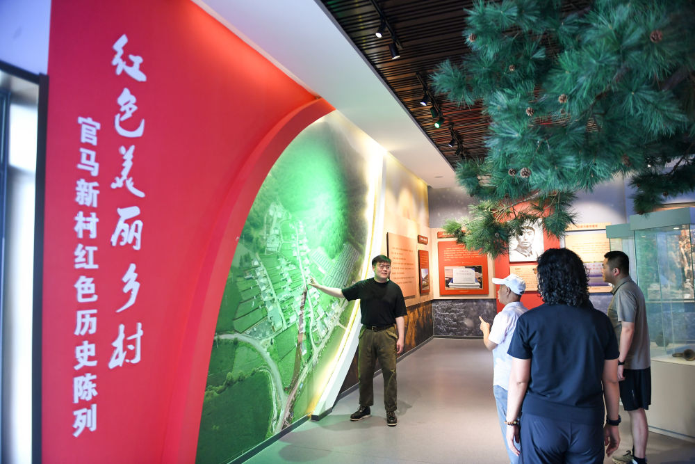 ↑ 8月11日,在磐石市官马新村红色历史陈列馆,马铖明(左一)为游客介绍抗联历史。