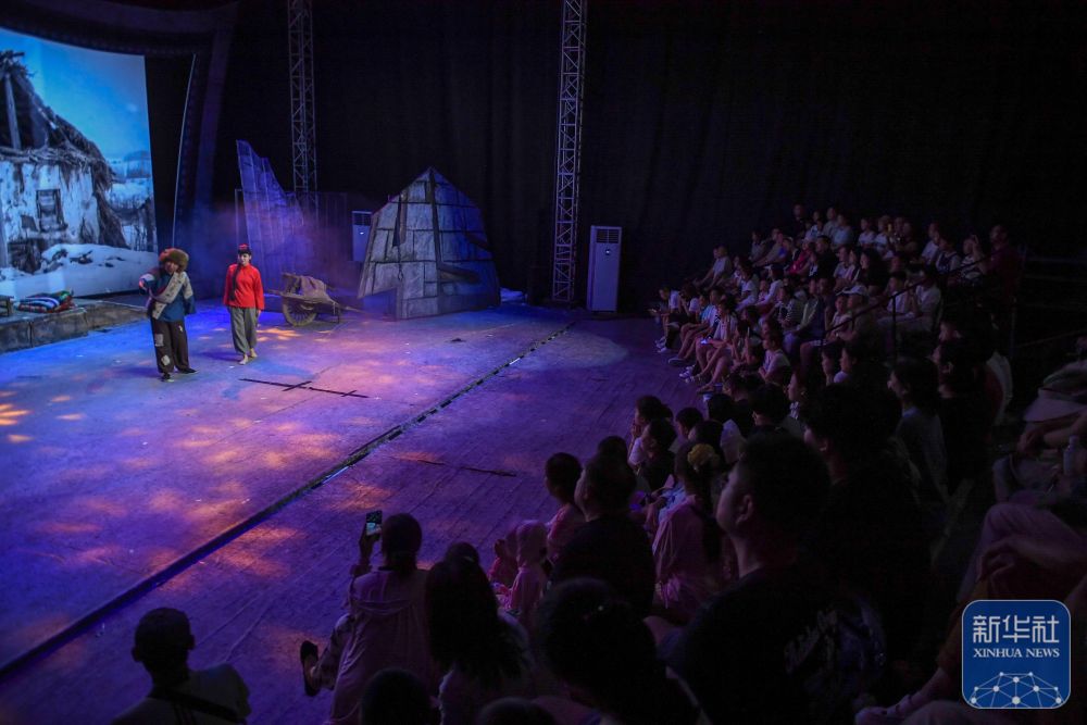 ↑ 8月7日,游客在长影旧址博物馆观看电影歌舞剧《白毛女》。