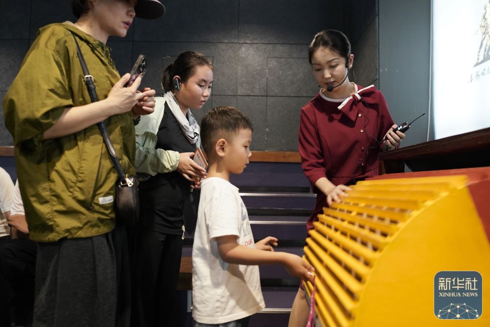 ↑ 8月7日,小朋友在长影旧址博物馆拟音互动室参观体验。